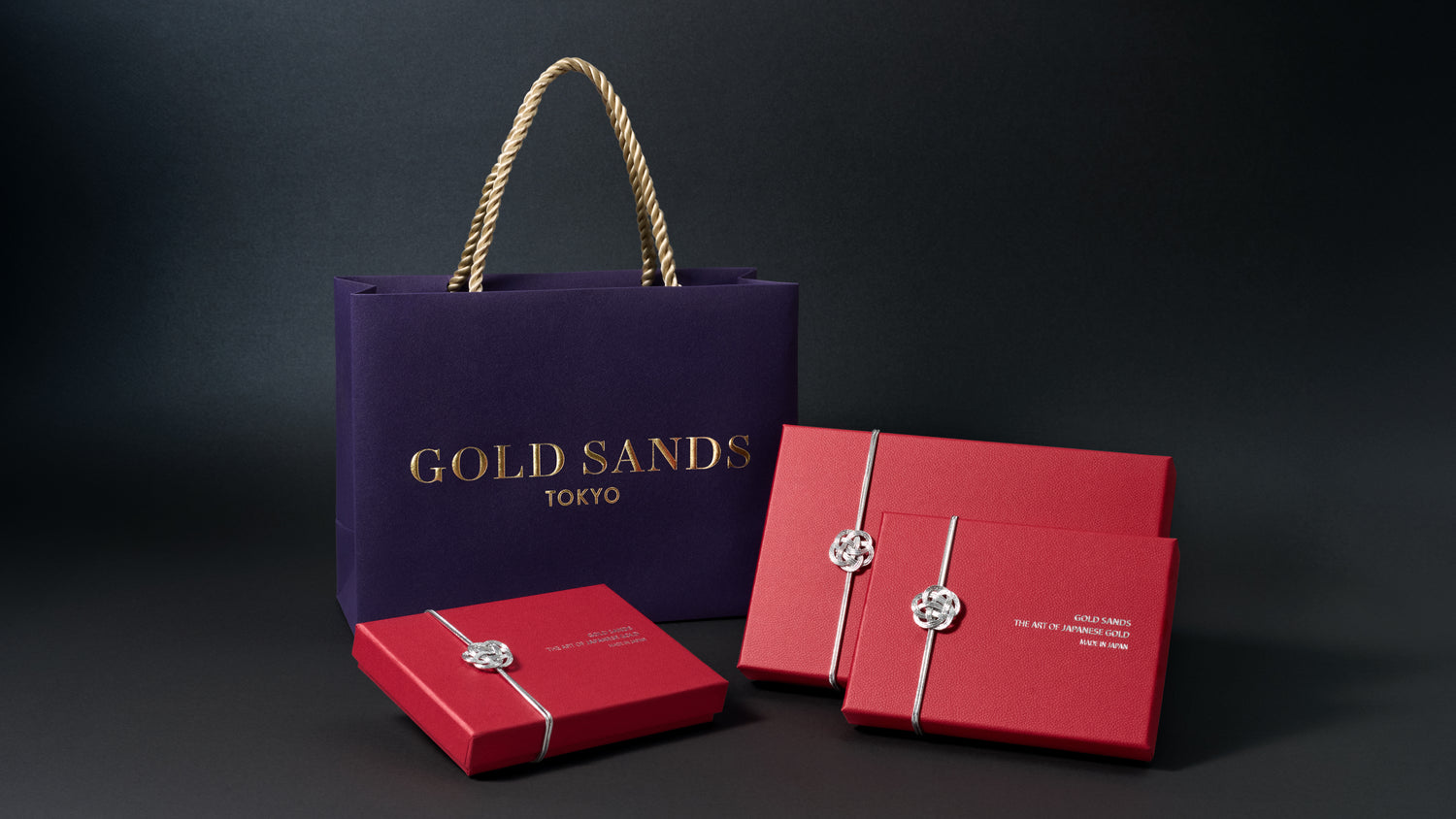 日本の至宝に相応しい、ゴールドサンズの製品を引き立てる梱包ボックス及びショップ袋は、日本ならではの美意識、その意味合いを大切にし、日本の伝統色の中でも高貴とされる色を現代に蘇らせました。